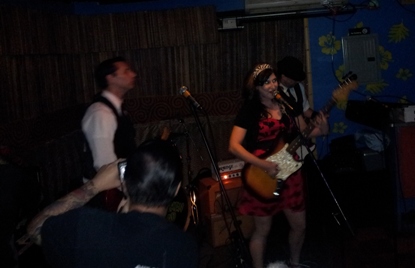 Pictured: The Evil Streaks, Back of This Guy's head (left)Over the weekend, I was able to catch The Evil Streaks (Weird Jon wrote an excellent travelogue about his trip to see them) at Otto’s Shrunken Head. Always a joy, they were an excellent sight. One of the gents in the audience was wearing a Kings Of Nuthin’ t-shirt. In fact, you can see the back of his head in the shitty picture I took with my cell phone.