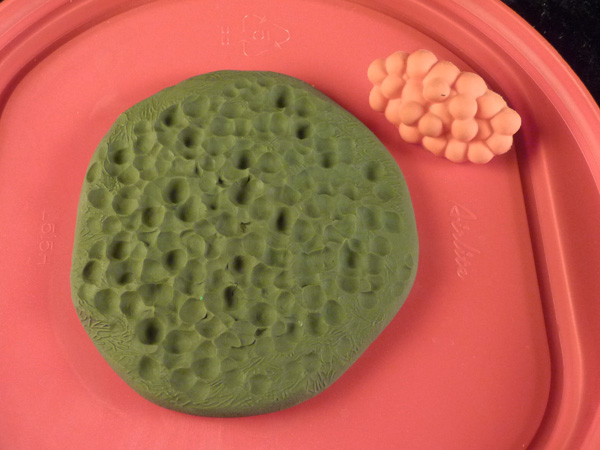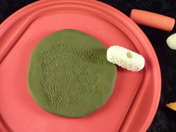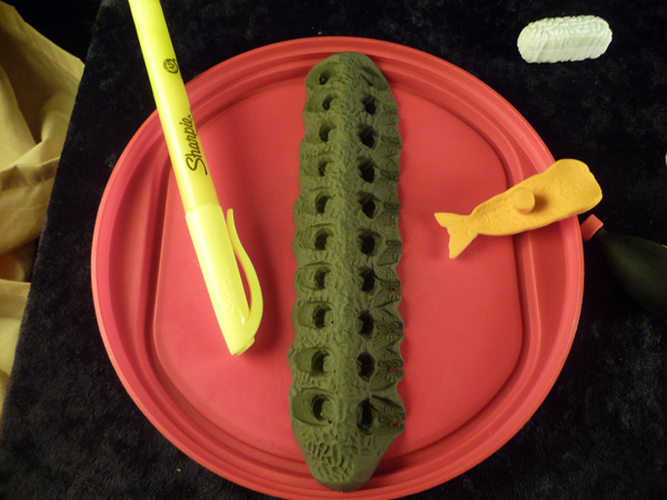 Combining stamps can produce some really neat effects. This was a rough ridge of clay stamped with the rice cake and then indented with the cap of a Sharpie highlighter. On the right I used the tail of the fish stampt to open it up a bit. The result is very Giger-ish.