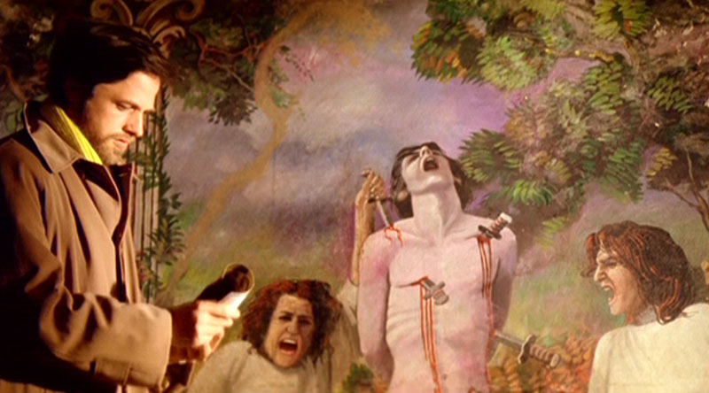 The stairway leads Stefano to a large, mostly empty room, where Legnani, the painter who committed suicide, who tortured and murdered local villagers in the pursuit of his madness, mixed his palette with paints and blood. The painter was aided by his two sisters, who shared in and inflamed his insanity. All this ties to the fresco in the church that Stefano is restoring, and as he slowly uncovers more and more of the painting, he begins to delve deeper into the life and death of Legnani and the secret of the house with laughing windows. The priest in the church is non-committal: he can take or leave the restoration. But why? The assistant to the priest is an oddball who does nasty things and is allowed to. But why? Stefano’s nervous friend, who involved him in the restoration, is desperate to tell him something important about the painting, but will he be able to since no one else wants Stefano to know?