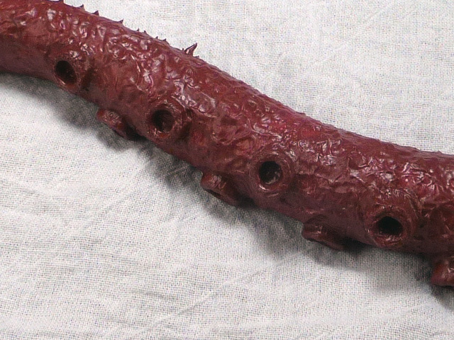 If you haven’t read the earlier tentacle tutorial here’s a quick recap: the main body of the tentacle is formed from polyfill fiber rolled out in an elongated cone shape around a floral wire core. That in turn is wrapped in layers of cling wrap plastic to give it a firm body. The whole thing is then coated with layers of liquid latex colored with craft paint to provide a final surface texture.