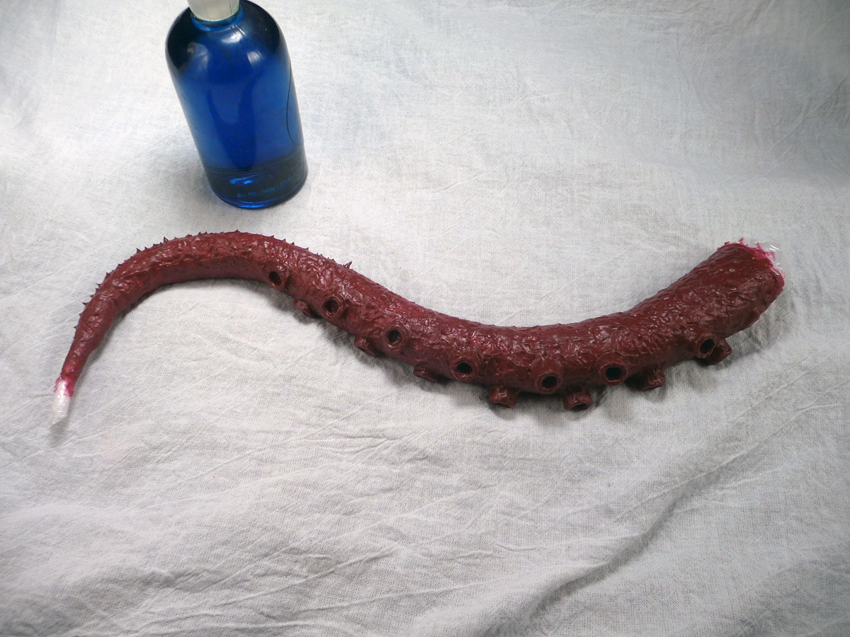 This particular tentacle is a test run using lengths of aquarium tubing as suckers. The tubing was trimmed with a razor knife and then fixed to the body using liquid latex. The latex doesn’t adhere to the tubing particularly well, but one of the wonders of liquid latex is that it bonds to itself magnificently. You can coat the tubing with a rough layer of latex, let it dry, and then take advantage of that mechanical bonding to attach the tubing. Once you apply a few more layers of latex the suckers aren’t going anywhere.